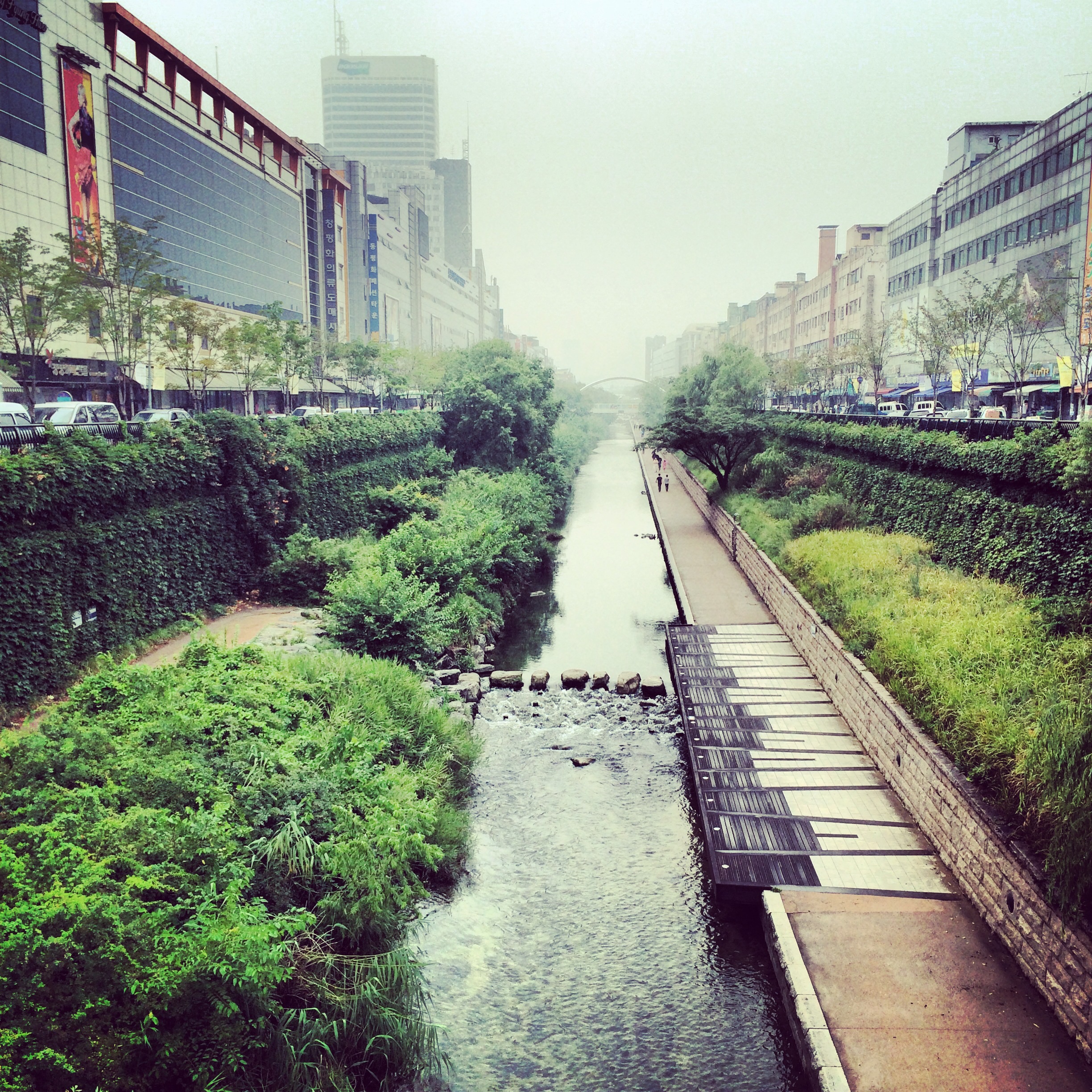 Cheonggyecheon (청계천) is a 10.9 km long man made stream that cuts through the centre of Seoul.