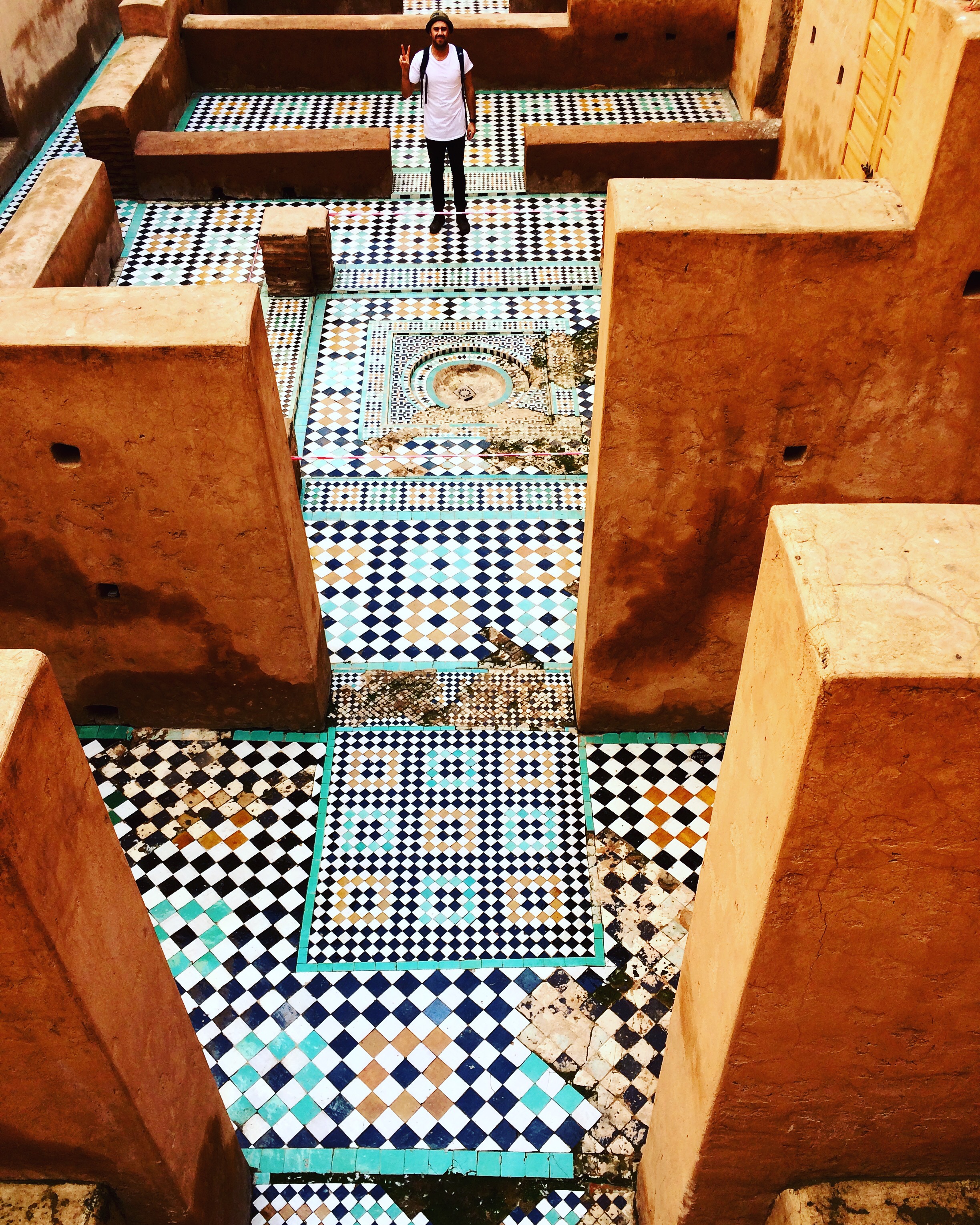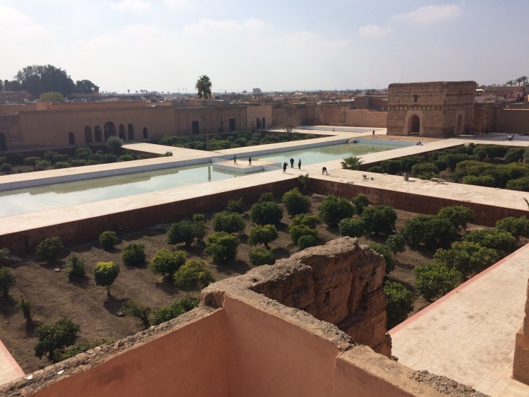 We make our way to Badia Palace. Amazing architecture again, a former Sultan’s palace, the huge gardens are divided symmetrically into quadrants, some containing orange trees, some with large water pools. You can just imagine the parties the bloke would have thrown here with his multiple wives! Living the dream. There are remnants of the beautiful tiles that would have lined the walkways, and the tower affords a fab view of the rooftops and just how dense the Medina is with roofs covered in satellite dishes and clothes and rugs airing.