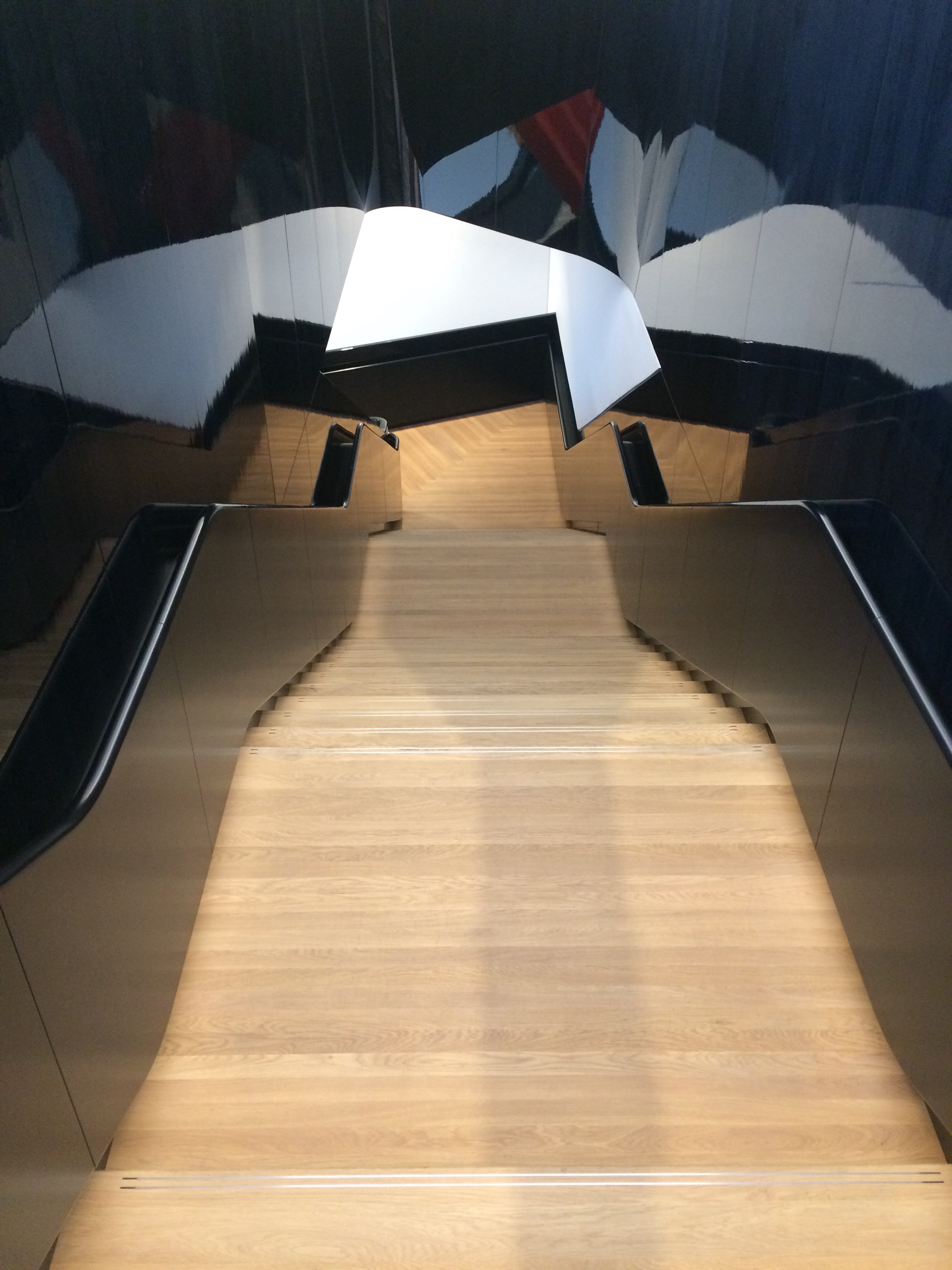 Attending the first exhibition in the new Levete designed exhibition space, I am initially struck by the descent into the gallery. Wooden stairs lead to the unknown – with shiny black lacquered cladding on either side.