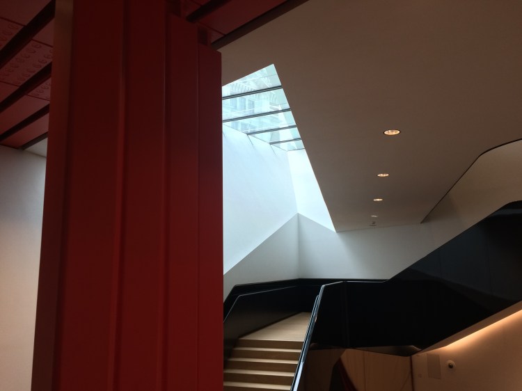 Outside the courtyard is bright white with its porcelain tiles on a gloomy grey London day. The courtyard whilst interesting to look at does not feel comfortable, warm or inviting. It is an entrance rather than a courtyard in this respect because it doesn’t feel like a place you want to sit and absorb the space around you.