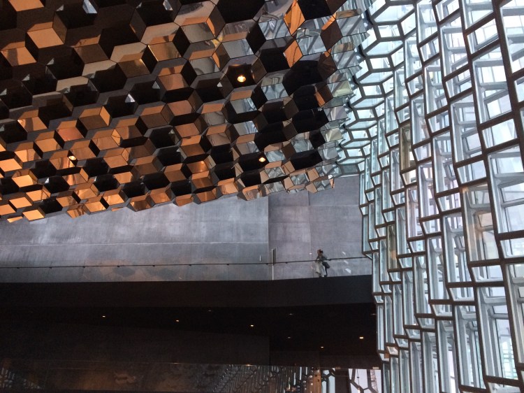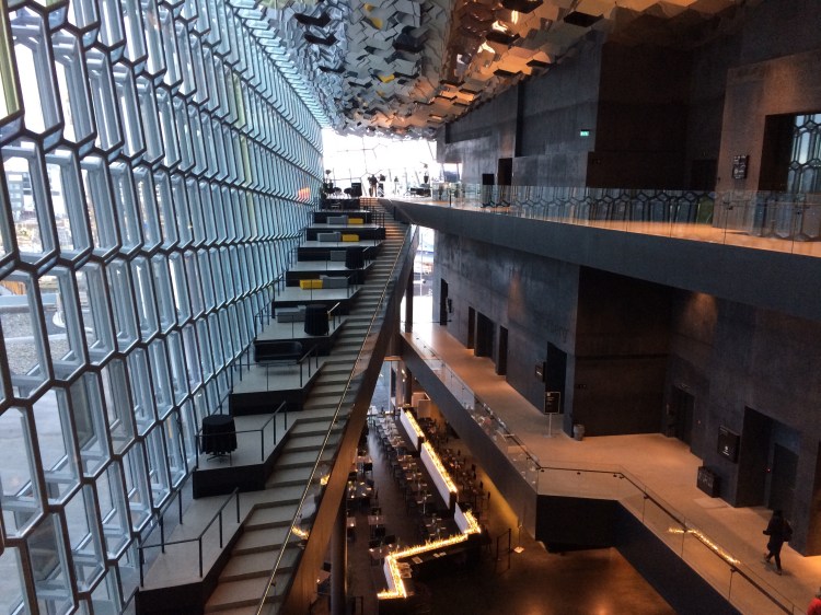 We fought the sporadic rain and stumbled into Harpa Concert Hall to escape the elements. I’m really glad that we did. This building features a healthy amount of references to the Icelandic landscape. The glass curtain walls and mirrored ceiling reflect the geometry of the crystalline basalt columns – a fancy rock formation native to Iceland. The use of black and grey are reminiscent of the harsh volcanic rock that covers the ground – and combined, they reflect the natural landscape of Iceland.