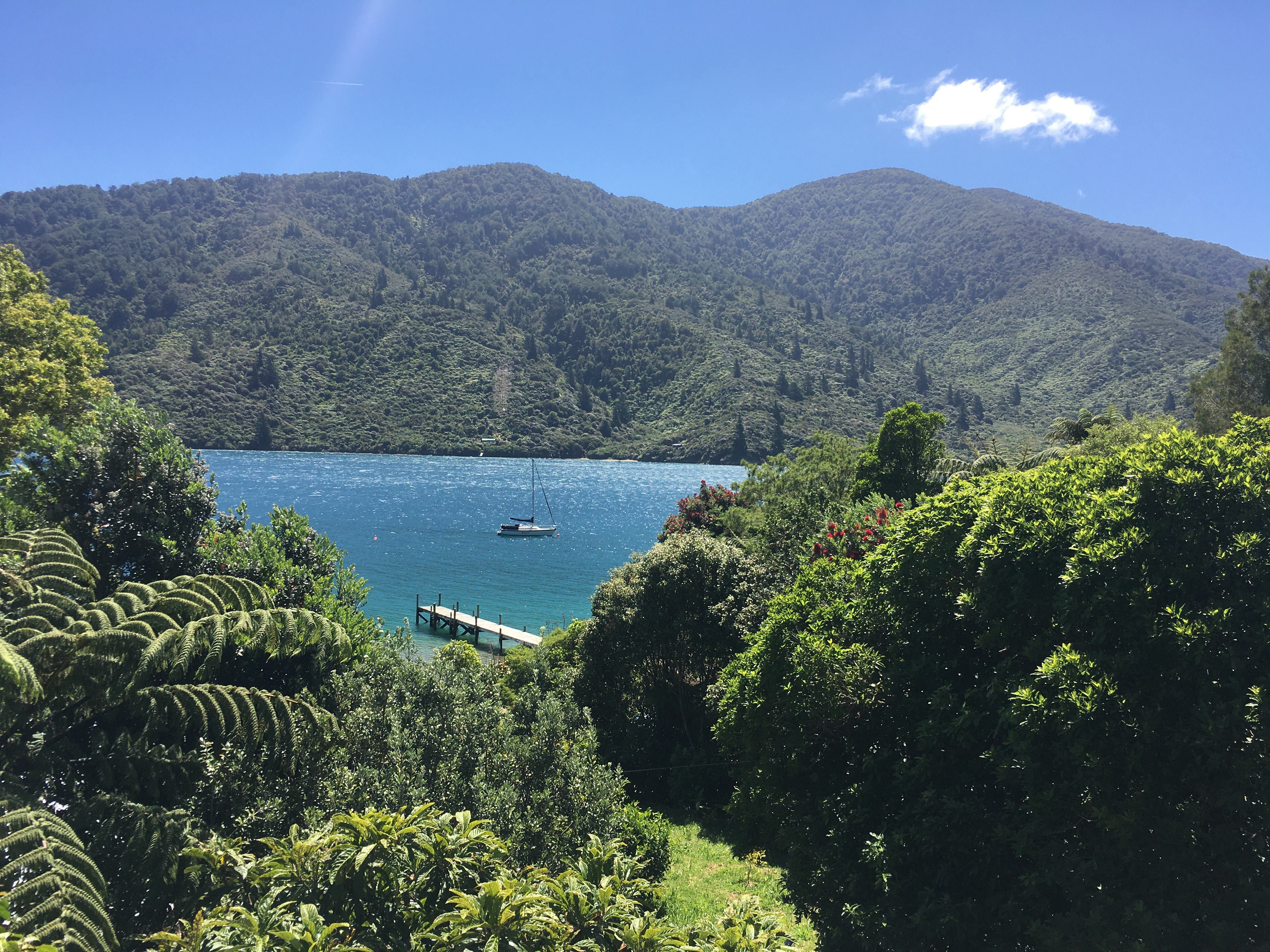 So, turns out my boy was not lying! All these things were 100% true, and my goodness what a place. The trip there in itself was epic and unlike anything I’ve ever done before. From Auckland we flew to Wellington (a place I would love to explore one day), then caught a 3.5 hour mega ferry to Picton across the Cook Strait. Then from the tourist town of Picton, we caught a tiny ferry (the Cougar Line, did they name that after me? lol) to Endeavour Inlet. This took a further 3 hours, but my goodness it was beautiful. The lush green ferns on either side, completely swallowing up the landscape and the deep, cold indigo blue below. Every inlet had a bach. Some were particularly fancy and OTT and other were gorgeous little huts that had not been changed since they were built – probably because it must be such a logistic nightmare to build there! Not only the rugged fern, mountainous (complete lack of any flat surface) landscape but also the difficulty of getting in building supplies by boat.